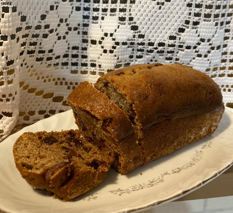 Mom loved to bake and would share her baked goods with family, friends and shut-ins. Her sweet rolls were well-known, but at Christmas, she mixed up a rich dough of dates, nuts, and raisins. When baked in a greased floured can, this dark brown bread could be sliced into a wheel that tasted so good.